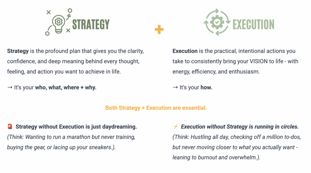 Strategy on its own is not enough. You can journal, brainstorm, and plan all day, but nothing changes until you execute. Execution is where your ideas meet your calendar. It is where your values show up in your actual schedule. It is where you prove to yourself that you can follow through.